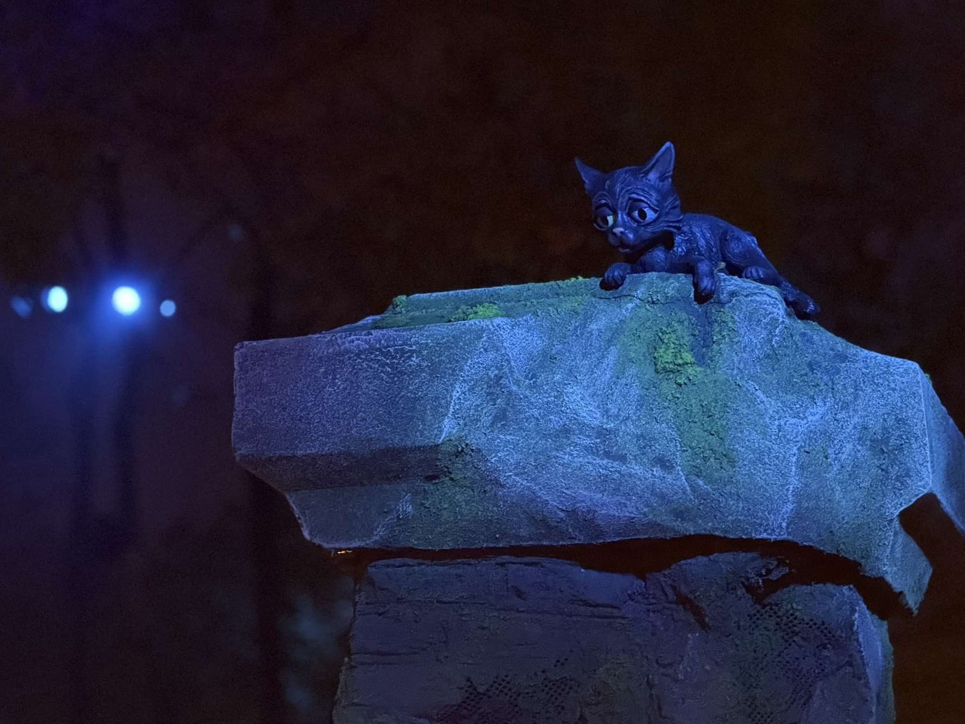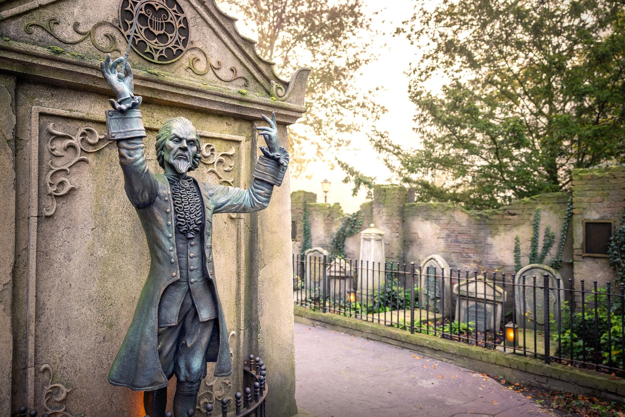 Les extérieurs de Danse Macabre ne sont pas que ruines et murs mousseux. Des indices sur l’histoire commencent à être glissés dès le portail d’entrée avec un chat noir aux yeux vairons observant les passants de haut. Plus loin dans la file d’attente, les groupes d’une centaine de personnes sont formés dans un cimetière où l’histoire du lieu est contée par une voix, mais cela est malheureusement incompréhensible des non néerlandophones, alors qu’Efteling nous avait habitués à faire attention à ce point dans ses dernières créations.