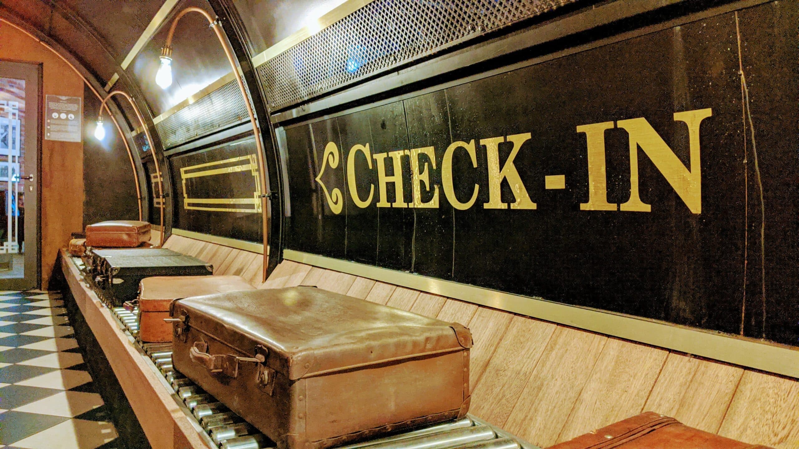 Une fois passé la porte d’entrée, nous nous retrouvons dans un long corridor servant également de lieu de transit pour les bagages des voyageurs venus du monde entier. C’est à quelques mètres de là que se trouve le Check-in. Une fois à l’intérieur, un doux parfum envahit la pièce. C’est celui de Charles Lindbergh, que nous avons manqué de peu. Il faut dire que l’homme à fort à faire, lui qui sera amené à réaliser de grands exploits en devenant le premier homme à voyager au-dessus de l’Atlantique en avion. Sur les murs de briques, se trouvent justement des photographies de pionniers tout aussi émérites, hommes et femmes qui ont ouvert la voie à l’aviation moderne.