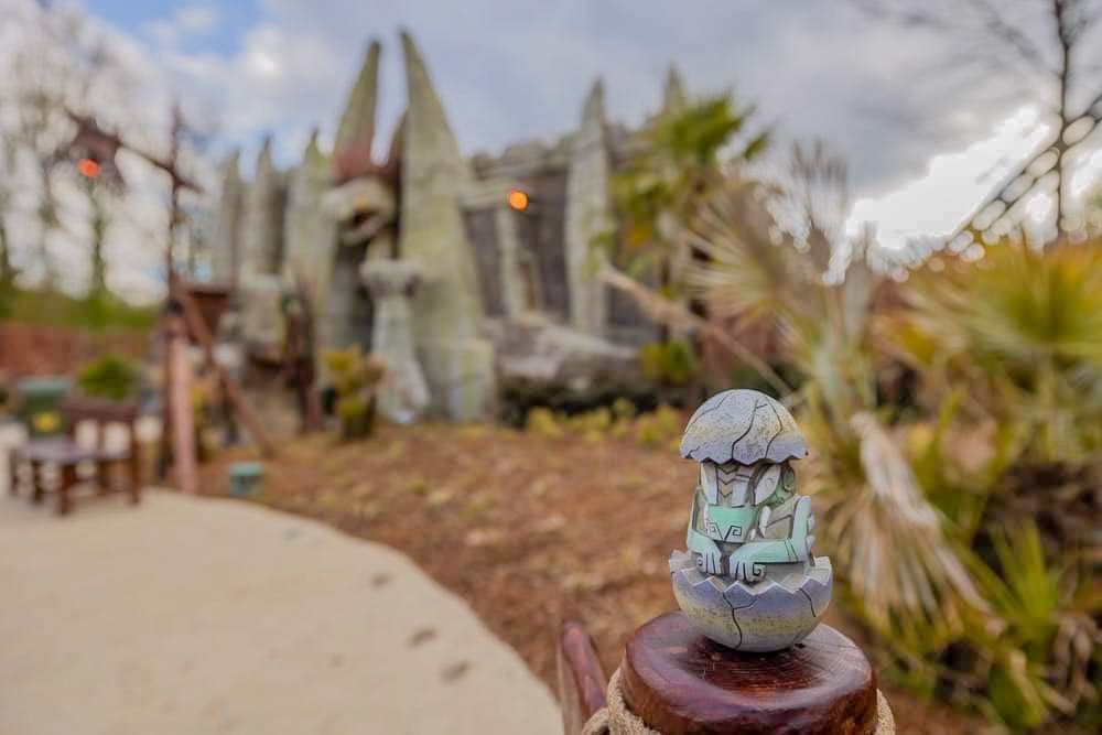 Juste avant de pénétrer dans la gare, une petite fresque représente la menace qui rôde, en duel avec un groupe d’humains pendant que d’autres subtilisent les fameux œufs. La (petite) gare est elle très joliment thématisée, avec des effets lumineux, d’autres fresques et une tentative de masquer le plafond métallique du bâtiment avec des éléments décoratifs.