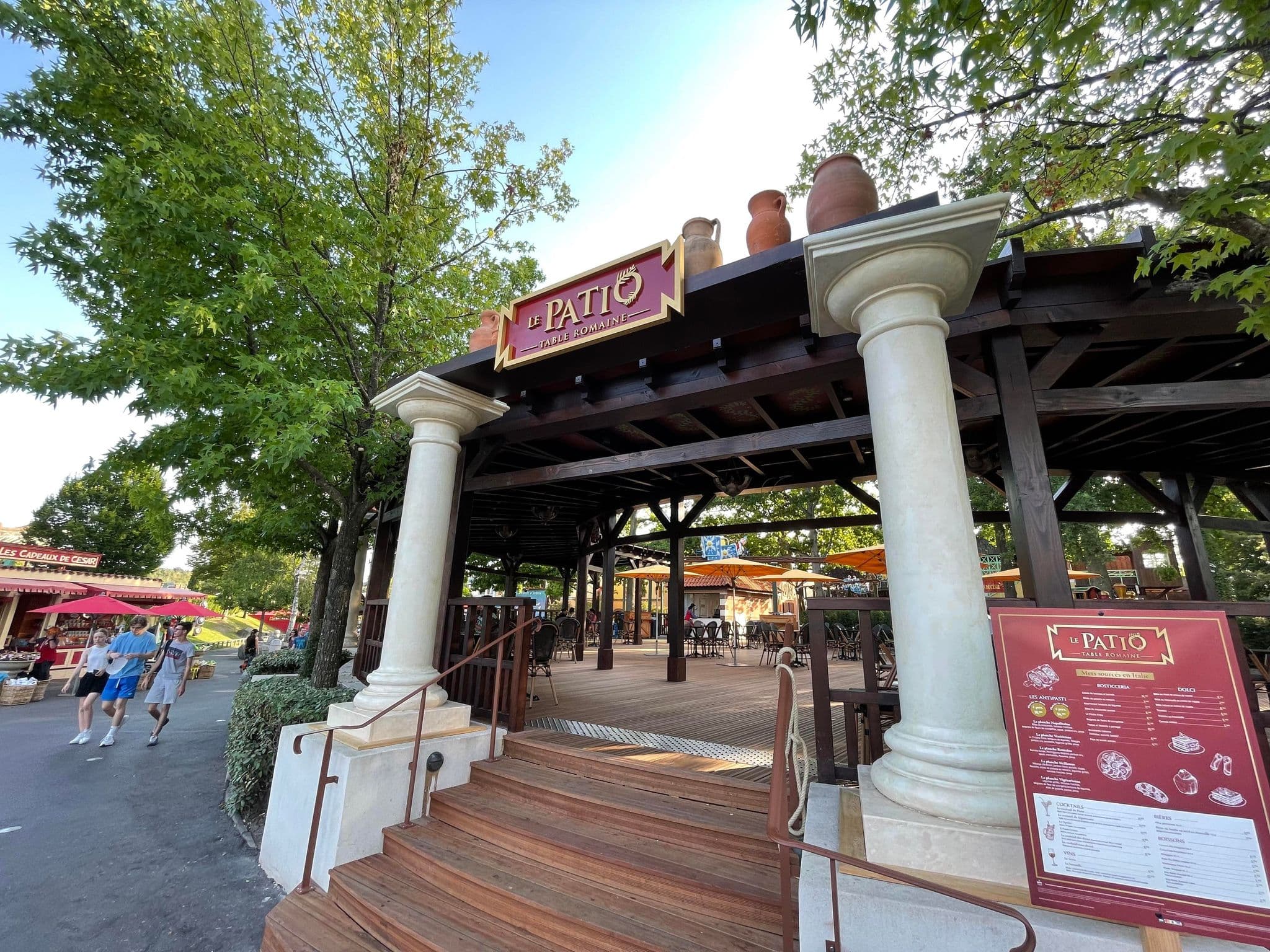 Et quand il ne réinvente pas un restaurant, le Parc Astérix en construit un : depuis l’été 2022, l’univers Romain compte une nouvelle alternative aux populaires Caïus Pizzarium et Fastes de Rome : le Patio – Table Romaine. La promesse du lieu, ayant pris la place de la Flottille de Néron : faire voyager les papilles des visiteurs grâce à une carte faisant la part belle aux saveurs italiennes : vins italiens, bruschetta, baba au rhum ou encore tiramisu.
