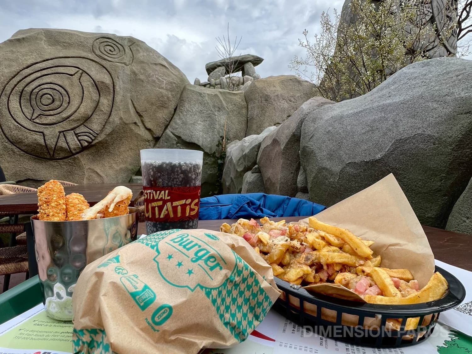 Dans une stratégie de « premiumisation » de l’offre de restauration du parc, la carte se compose essentiellement de burgers gourmets et affiche des prix bien plus onéreux que les autres restaurants de même gamme. Comptez ici entre 17 € et 18 € pour la formule burger + frites, avec un choix parmi les nombreuses déclinaisons : bœuf, poulet, poisson et même vegan. Les plus gourmands ont la possibilité de faire un « upgrade » de leurs frites en « frites gauloises » (avec tomme au foin fondu et lardons) pour un supplément de 2 €.
