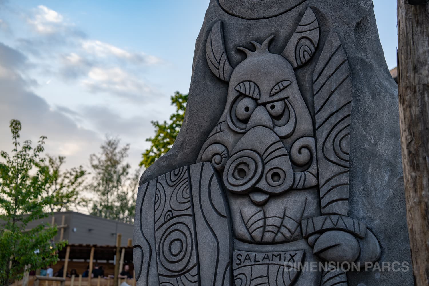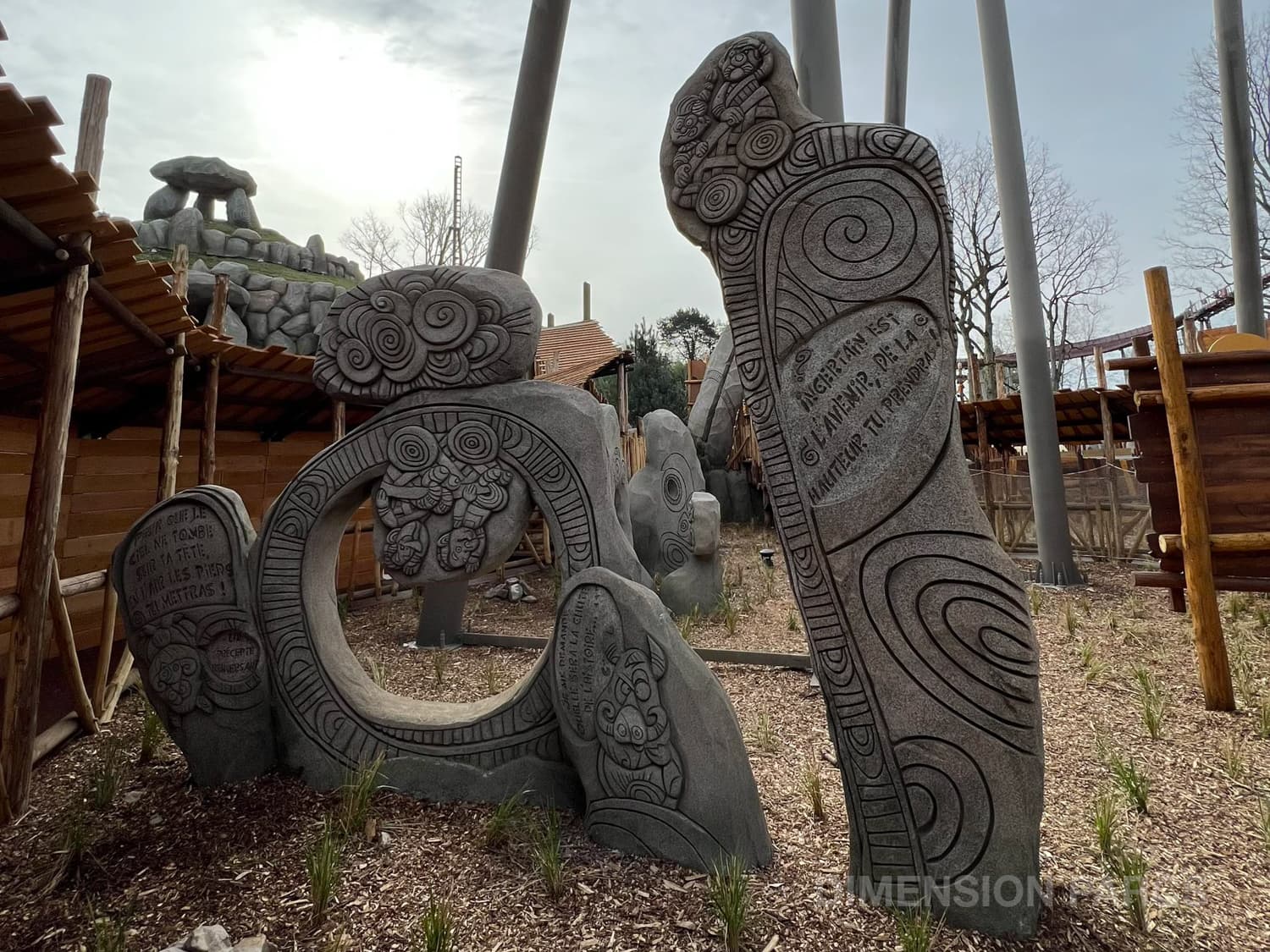 Le reste de la zone est ponctué de monticules de terre et de dolmens, avec un soin apporté aux finitions comme rarement vu au Parc Astérix. Les banderoles de feuilles orangées et les panneaux très colorés tranchent parfaitement avec le côté terne de la pierre qui prédomine dans les environs.