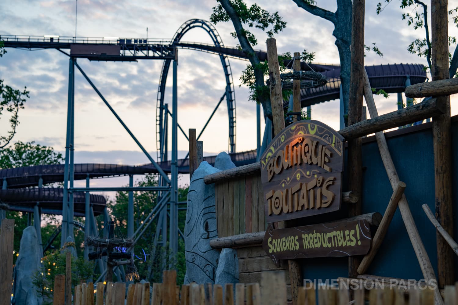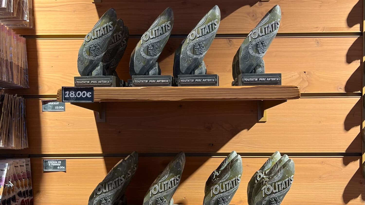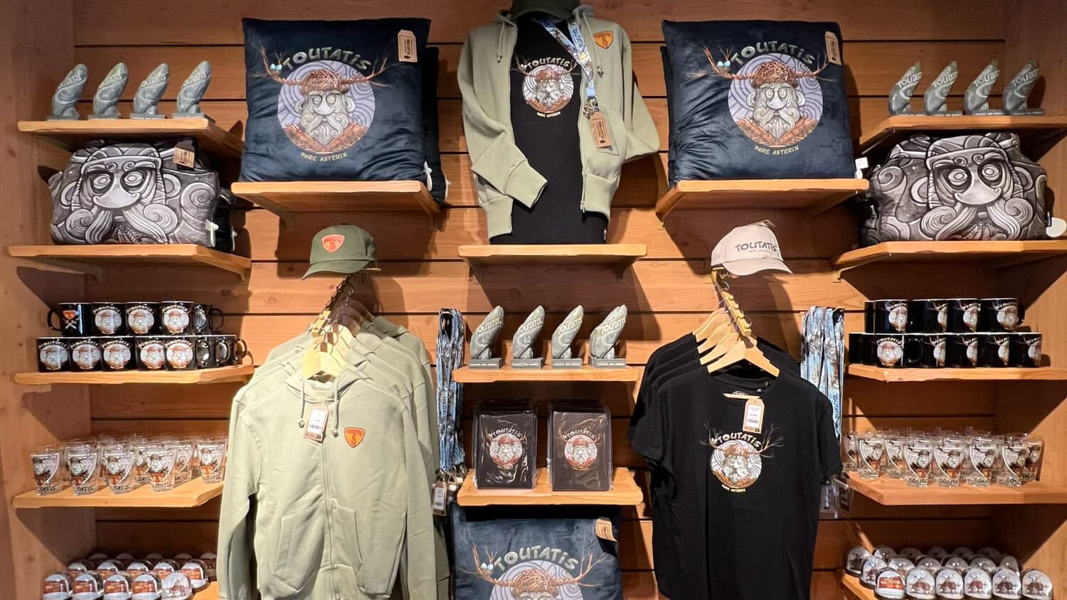 Après leurs prouesses, les visiteurs peuvent repartir avec un chouette souvenir, en faisant un tour à la Boutique Toutatis. Si le nom n’est pas très inspiré, les produits dérivés le sont beaucoup plus, déclinant l’univers graphique de Toutatis en t-shirts, boules à neige et incontournables mugs. On soulignera le travail des équipes en charge des boutiques, qui proposent des produits 100% dédiés à l’attaction, sans toutefois se limiter à des produits de type « J’ai survécu à Toutatis ». De nombreux accessoires et autres petits gags habillent une nouvelle fois les murs et étagères de l’échoppe.