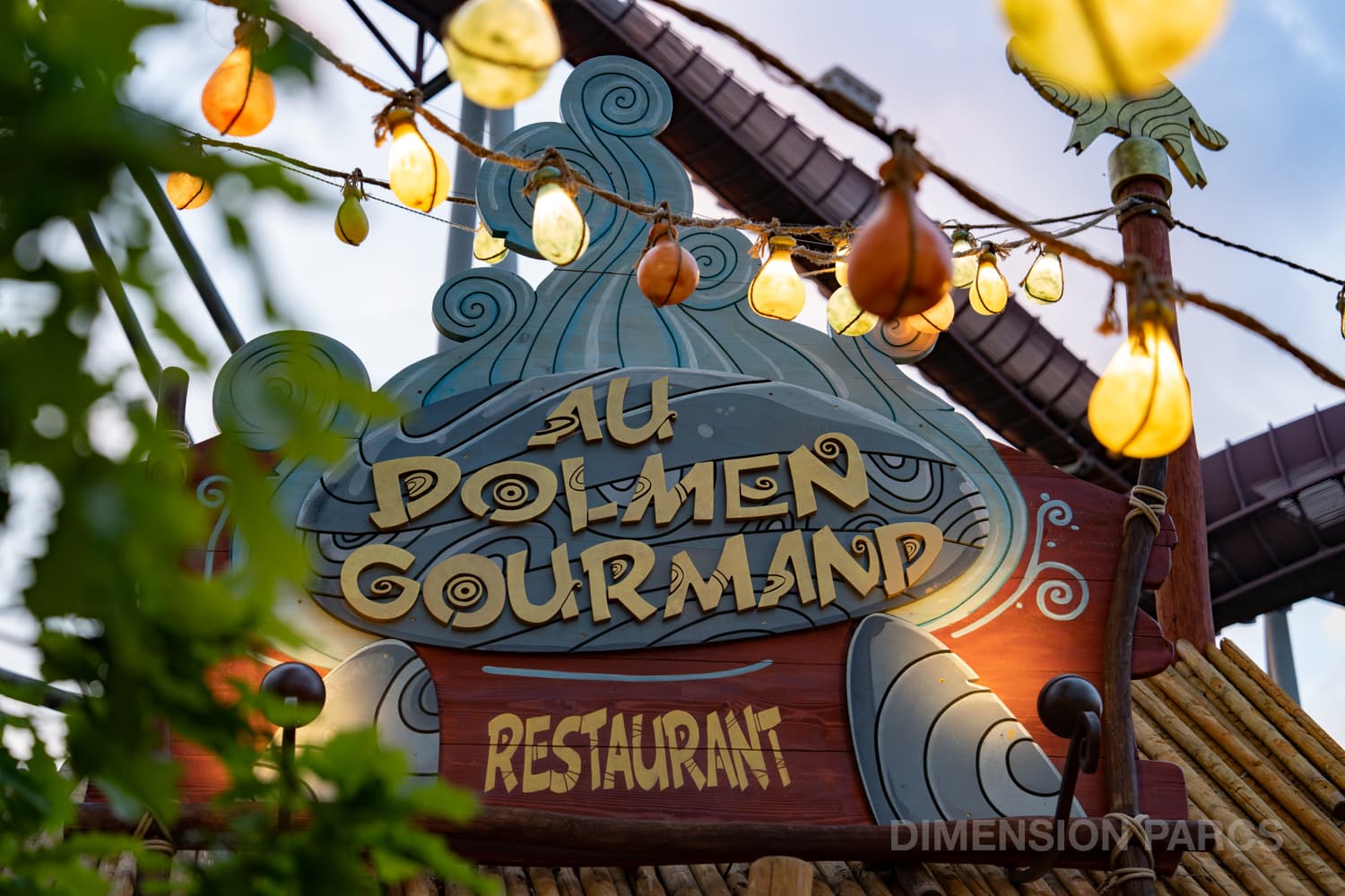 Pas de festivités gauloises sans aborder à un moment donné la question de la nourriture. Pour cela, le restaurant fast food de 200 places « Au Dolmen Gourmand » permet à toute la famille de reprendre des forces entre deux aventures. Des bornes digitales sont disponibles à l’extérieur et permettent de passer commander plus rapidement. Une grande terrasse avec de nombreux espaces couverts (pratiques en cas de forte chaleur ou de pluie) offre une magnifique vue sur Toutatis.