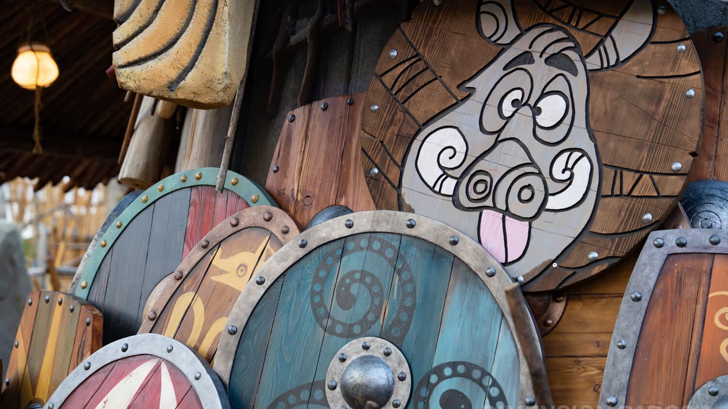 D’ailleurs, un peu plus loin, on retrouve une énorme statue de Toutatis, de près de 11 mètres de hauteur, dominant la place centrale. Armé d’un glaive et d’un bouclier, ce dernier protège majestueusement les tribus gauloises, qui ont tenu à déposer de nombreux boucliers à ses pieds. Ouvrez l’œil : de nombreuses touches humoristiques se sont glissées dans ce décor.