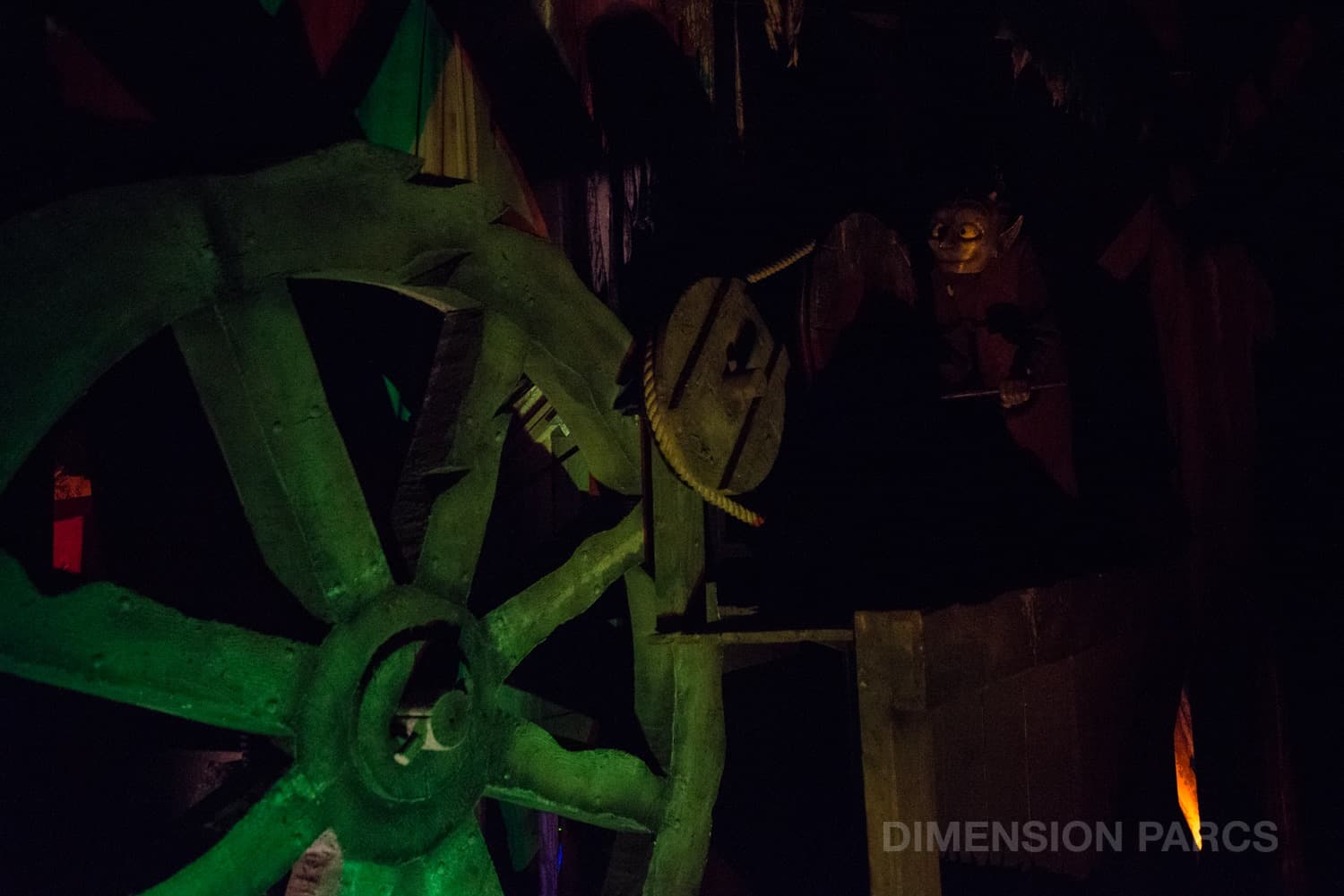 Le Transdemonium est donc un train fantôme sur le thème d’un train fantôme, le tout inscrit dans le Moyen Âge, ce qui implique que la machinerie qui l’aurait fait fonctionner à cette époque aurait été rudimentaire. Les créateurs de l’attraction ont pensé à cela en installant des décors représentant des rouages entraînant le train aux deux moments où celui-ci gravit une côte. C’est même, au premier d’entre eux, Mario qui entraîne le mécanisme à l’aide d’une manivelle.