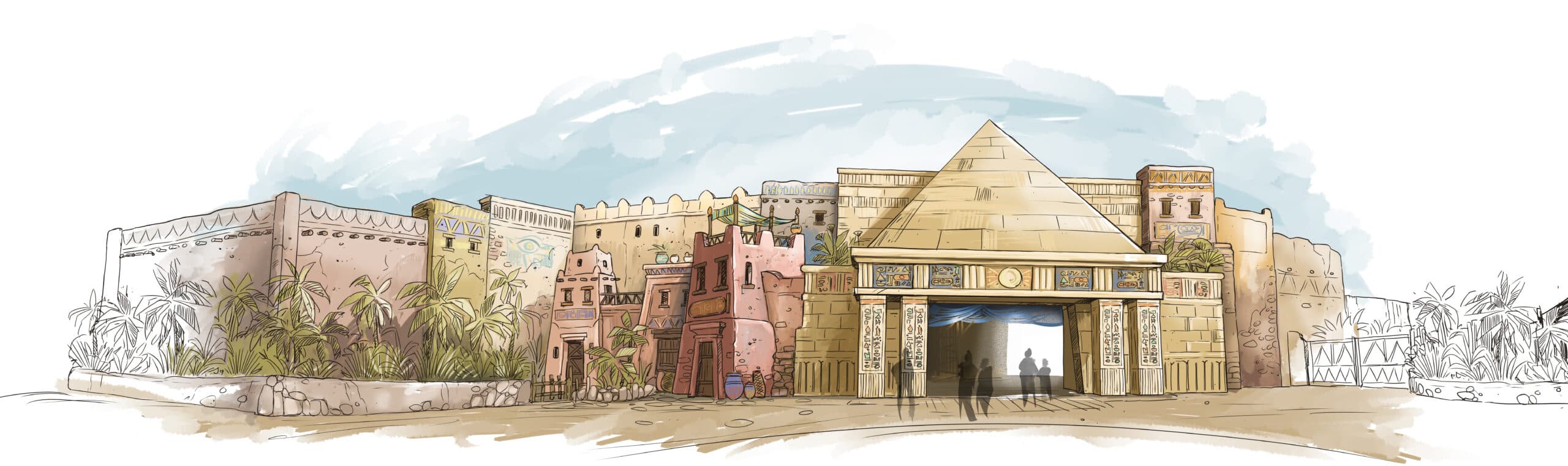 Un autre espace de vente sera mis en place dans le passage couvert de transition entre Londinium et l’Égypte. La boutique sera de thème égyptien, et sa façade côté Londinium reproduira celle du British Museum.