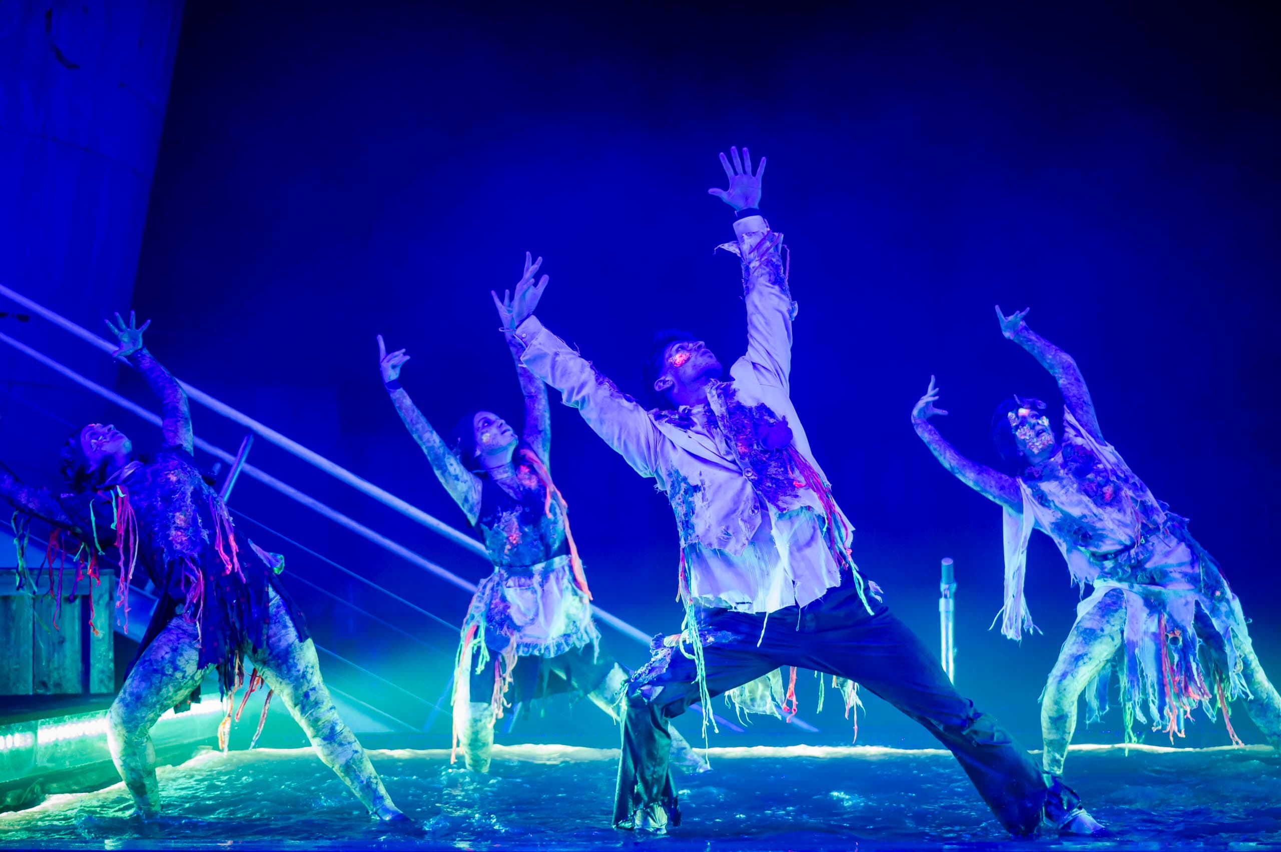 Dans la Malédiction du Sirius, l’ambiance est particulière et contraste avec ce qui existait déjà. Les équipes artistiques parient notamment sur un spectacle de danse aquatique qui est rapidement devenu un incontournable. Il s’agit aussi de la seule zone ayant une programmation différente la journée et le soir. En effet, lors des nocturnes, l’espace se transforme en piste de danse géante avec un DJ enflammant visiteurs et comédiens, tout en restant dans l’histoire. C’est aussi à ce moment qu’on peut y voir la version nocturne du spectacle de danse aquatique, grandiose et ensorcelant. Une véritable démonstration de force du Parc Astérix qui joue ici la carte de l’Halloween artistique, sans la moindre goutte de sang.