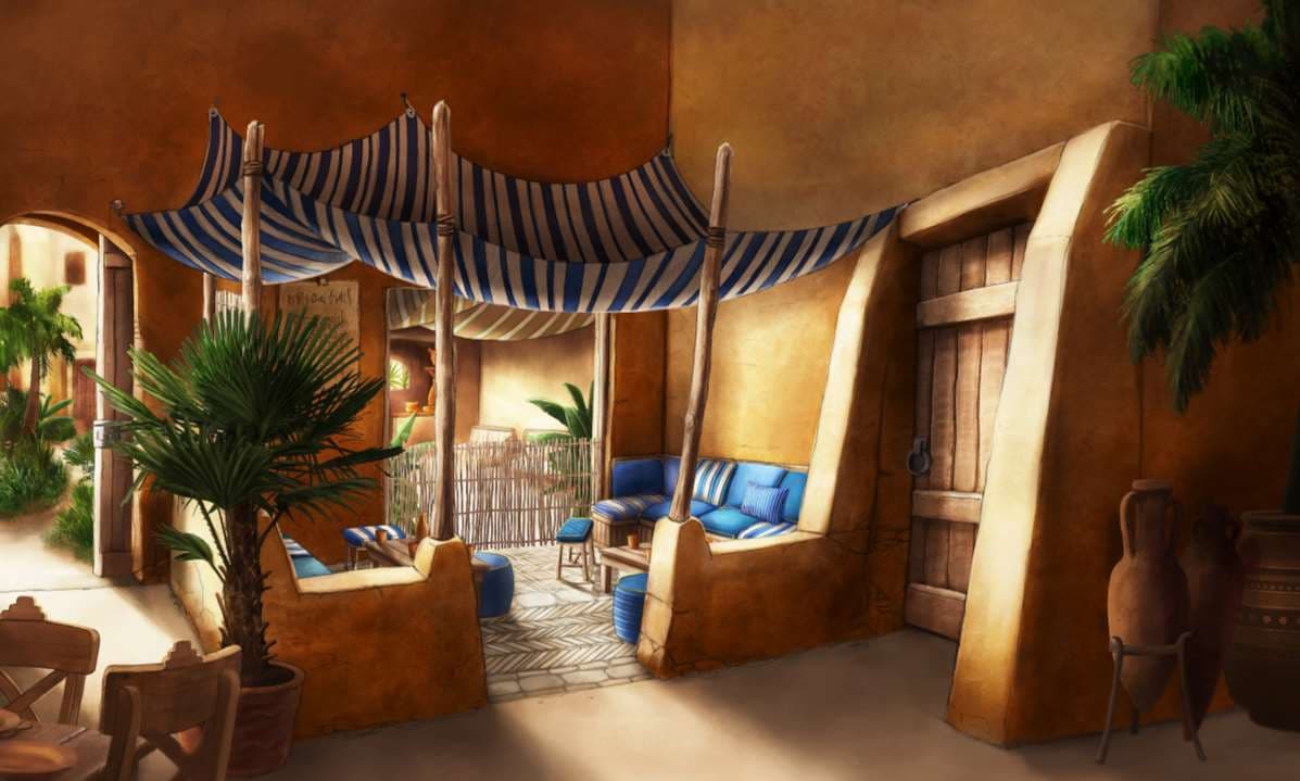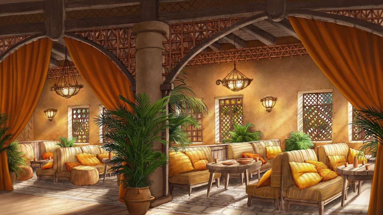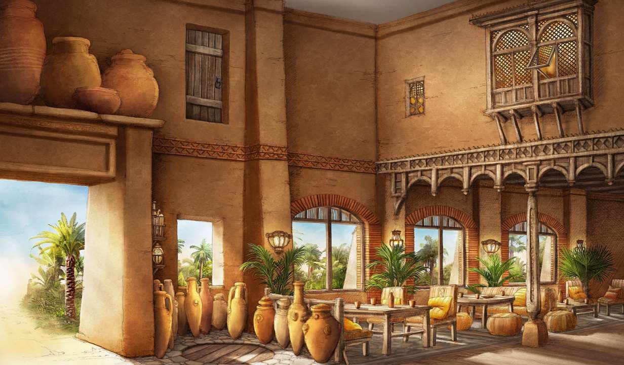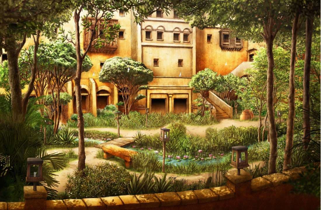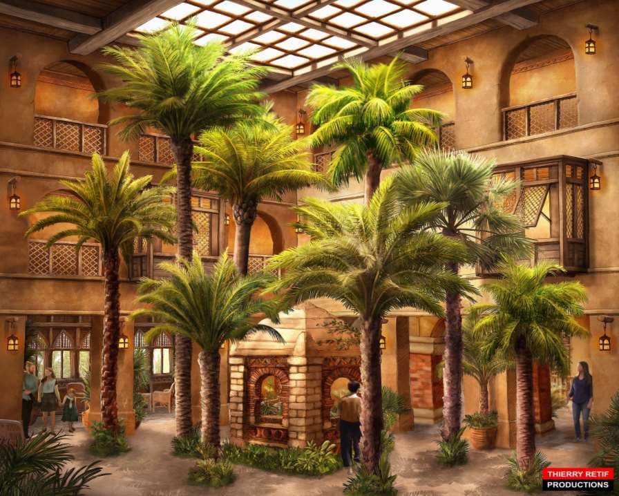 La cour sera divisée en quarte quartiers organisés autour d’un oasis central. On pourra ainsi visiter des jardins perses, phéniciens, égyptiens, ou encore mésopotamiens, répartis sur plusieurs niveaux. La décoration de chaque façade intérieure s’accordera avec l’un des 4 thèmes, contrairement aux façades extérieures qui seront d’un style plus fortifié et sobre.