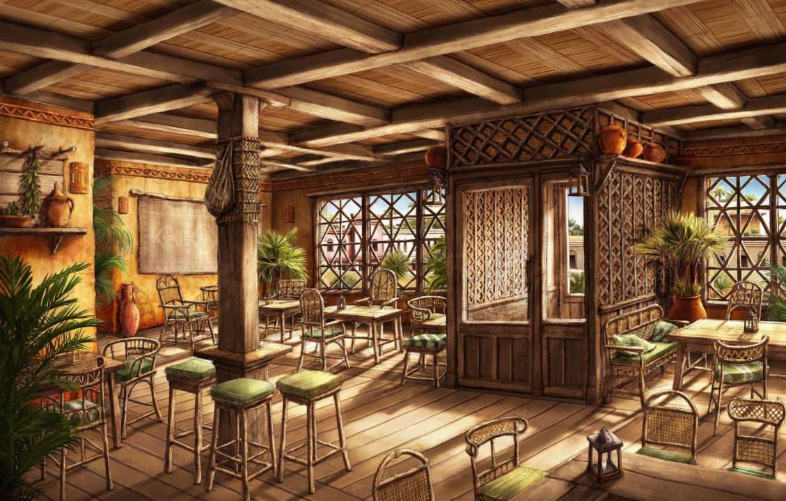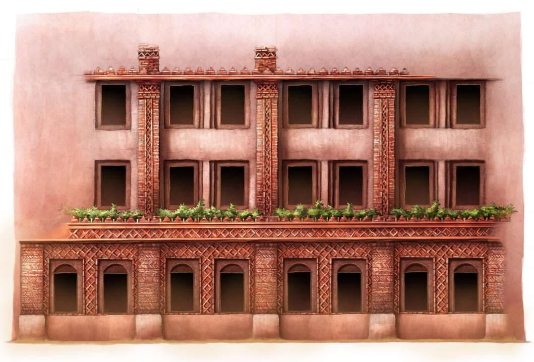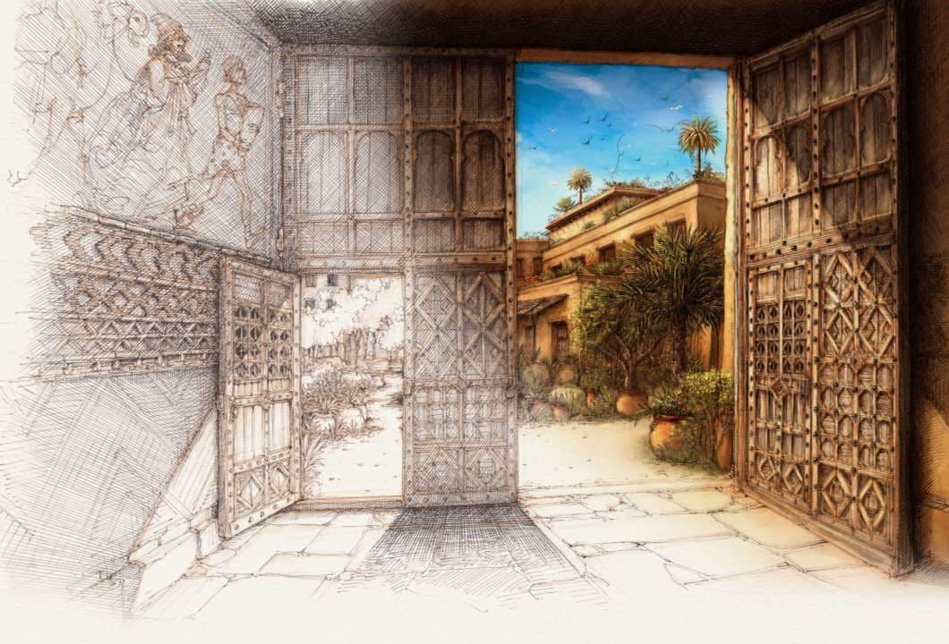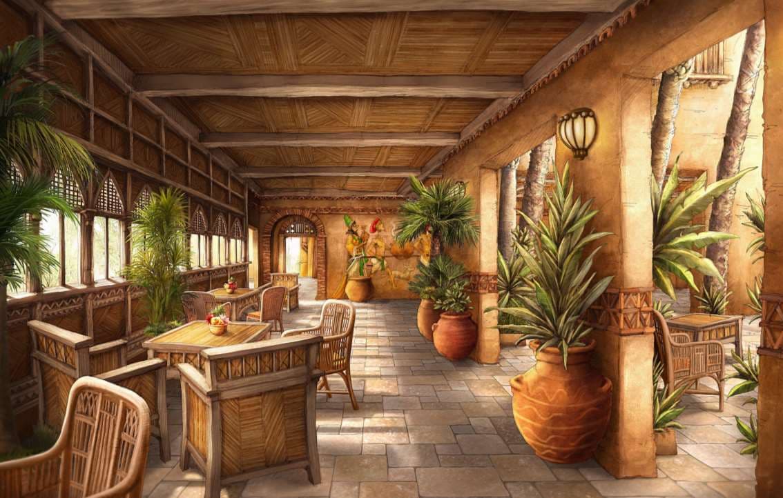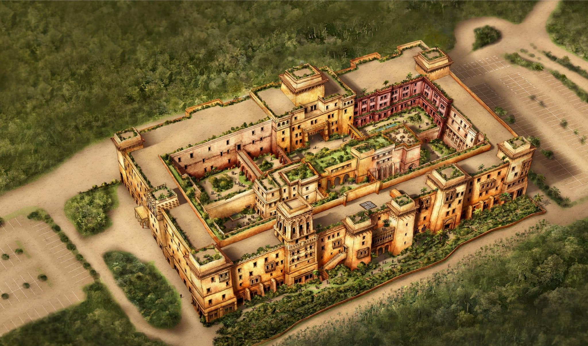 La cour sera divisée en quarte quartiers organisés autour d’un oasis central. On pourra ainsi visiter des jardins perses, phéniciens, égyptiens, ou encore mésopotamiens, répartis sur plusieurs niveaux. La décoration de chaque façade intérieure s’accordera avec l’un des 4 thèmes, contrairement aux façades extérieures qui seront d’un style plus fortifié et sobre.