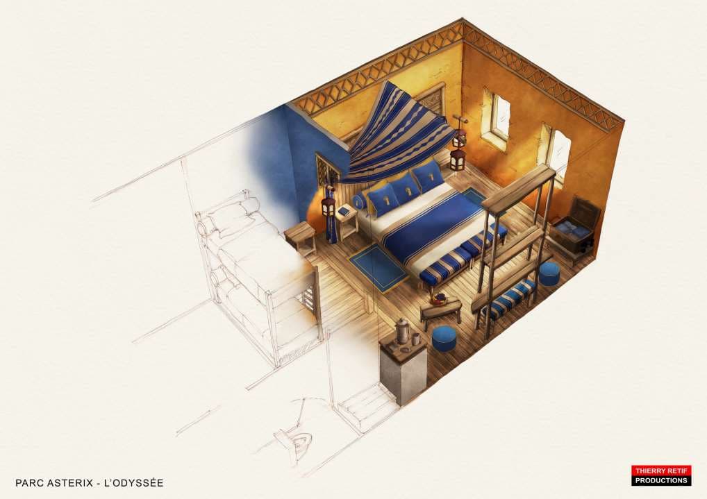 Fort de son environnement forestier, le Parc Astérix a orienté les thèmes de ses trois premiers hôtels autour du bois, mais un virage va être pris pour le quatrième avec un choix plus minéral. La scénographie va en effet s’inspirer des voyages orientaux d’Astérix, et particulièrement ce qu’a dessiné Uderzo dans l’album l’Odyssée d’Astérix.