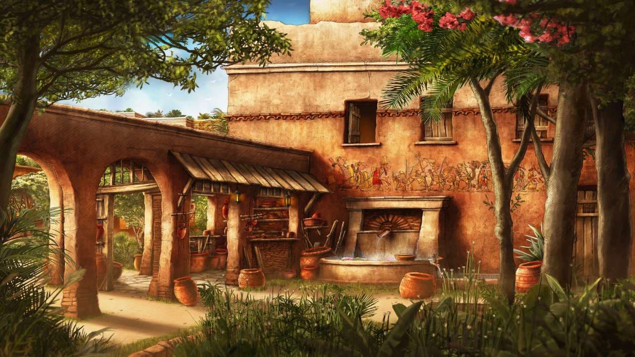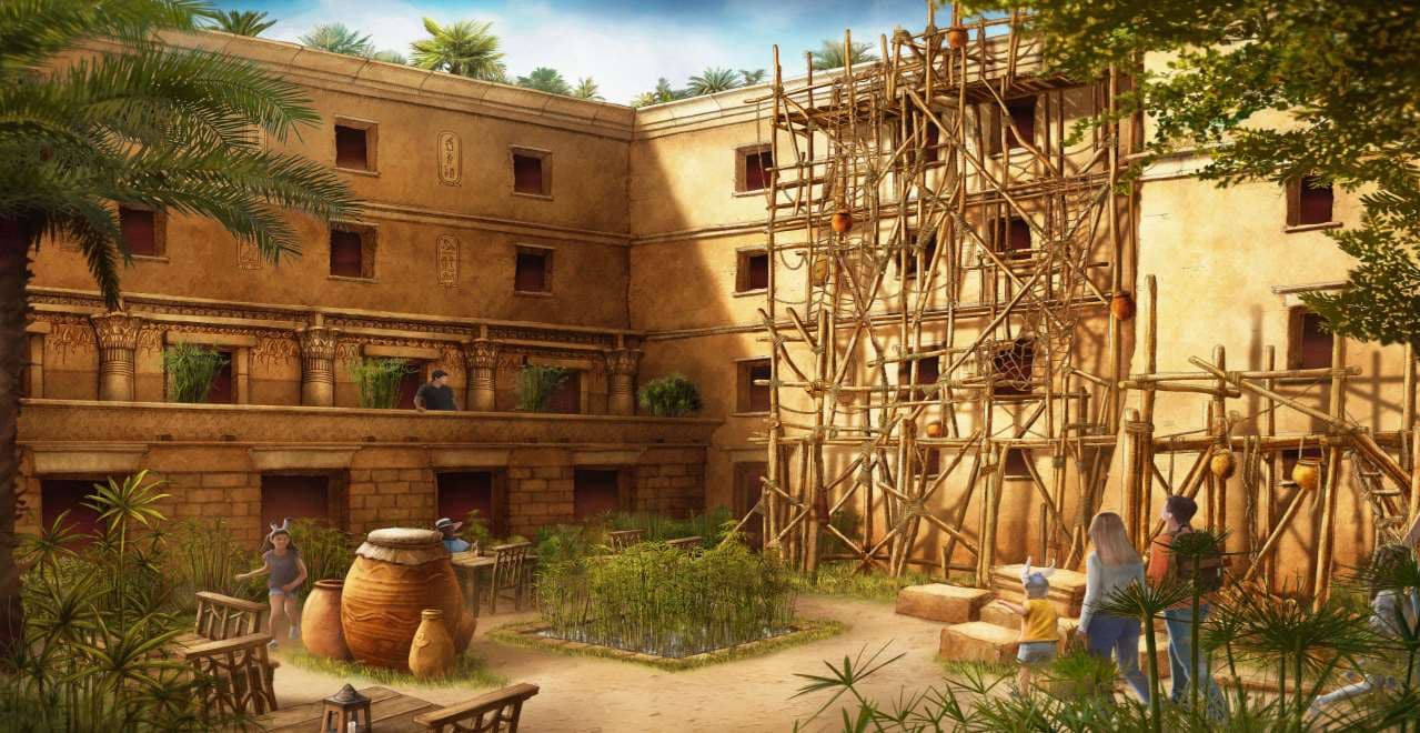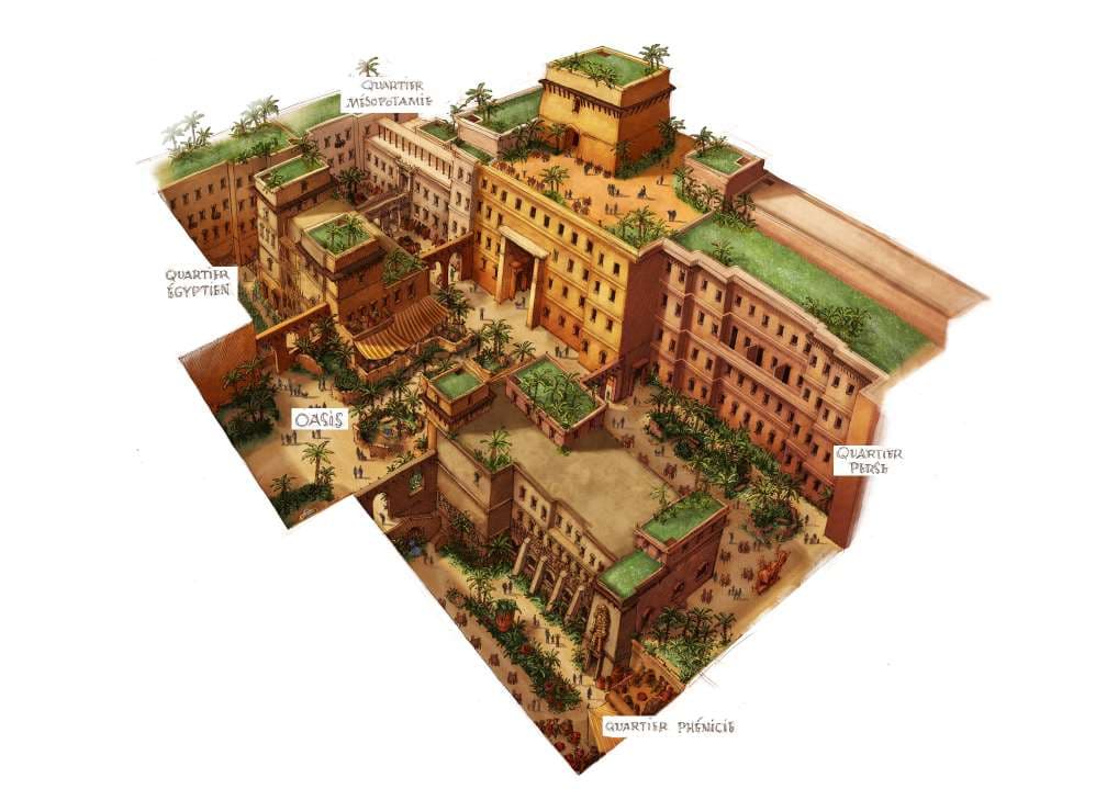 Pour finir, l’Égypte et son aspect monumental. La construction de ce quartier est d’ailleurs sous la direction de Numérobis, le fameux architecte d’Alexandrie, célèbre pour son grand talent mais aussi pour ses retards, comme l’en atteste les nombreux échafaudages encore présents.