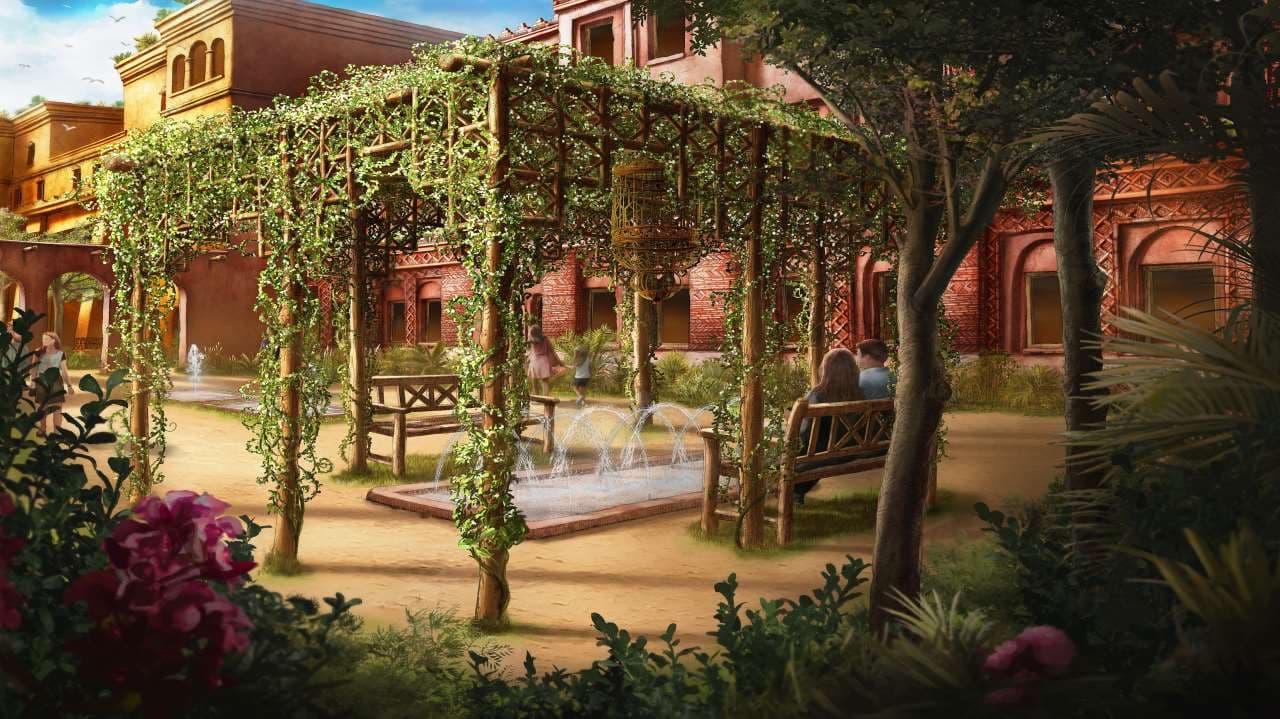 La sortie du bâtiment que les résidents emprunteront pour se rendre au parc sera aussi dans le thème, il s’agira d’un « Jardin des Grenadiers » luxuriant parcouru par un ruisseau.