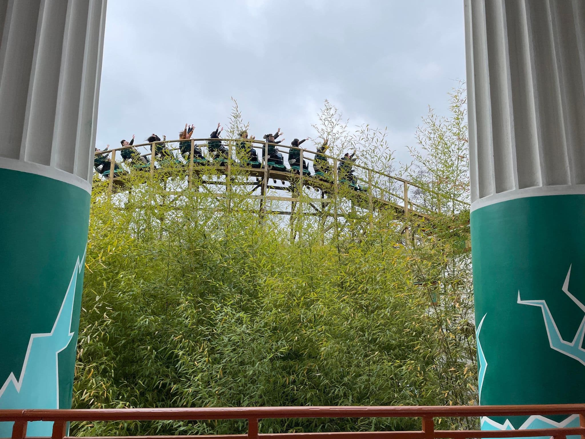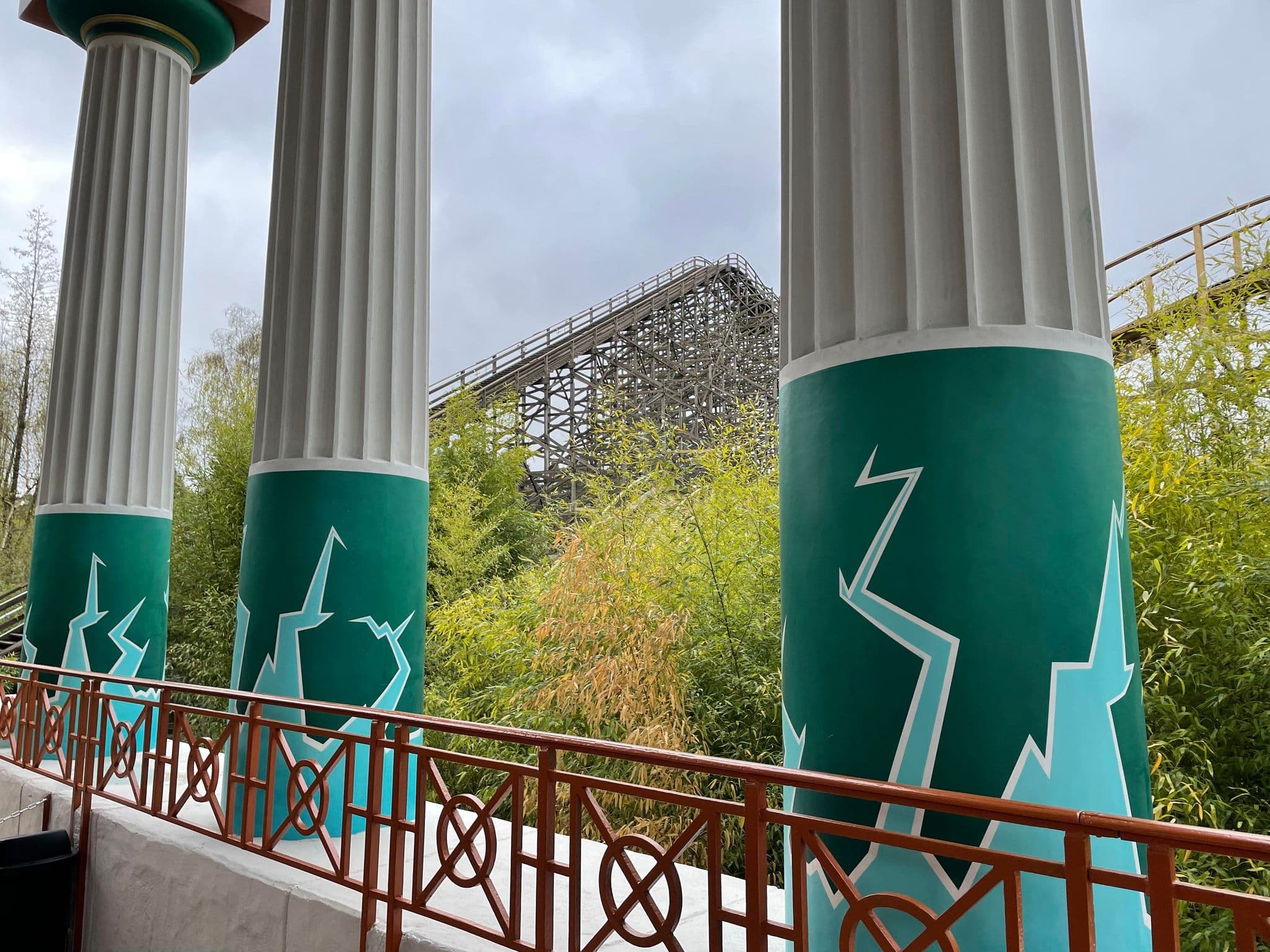 Après 1h d’attente, le grand moment est arrivé : les visiteurs peuvent pénétrer dans la file d’attente de Tonnerre 2 Zeus. De ce côté-là, peu de changement notable, si ce n’est quelques coups de peintures et une végétation (un peu) retravaillée. Mais le spectacle se situe au-dessus des têtes, avec les trains continuant de dévaler les nouvelles portions de rails en bois à toute allure !