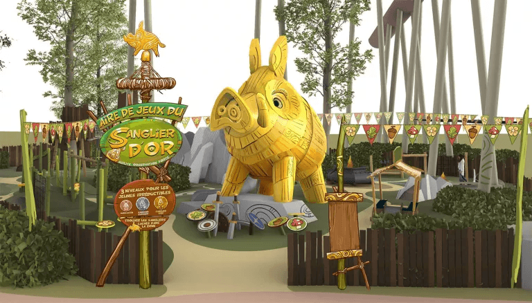Description : « Pour les petits gaulois l’aire de jeux la plus grande du Parc propose une multitude d’activités. Accompagnez vos enfants dans les différents parcours sportifs pour tester leur courage ! L’Aire de jeux du Sanglier d’Or attend les petits Gaulois, pour un entraînement intensif à base de toboggan, mur d’escalade, et filet.«