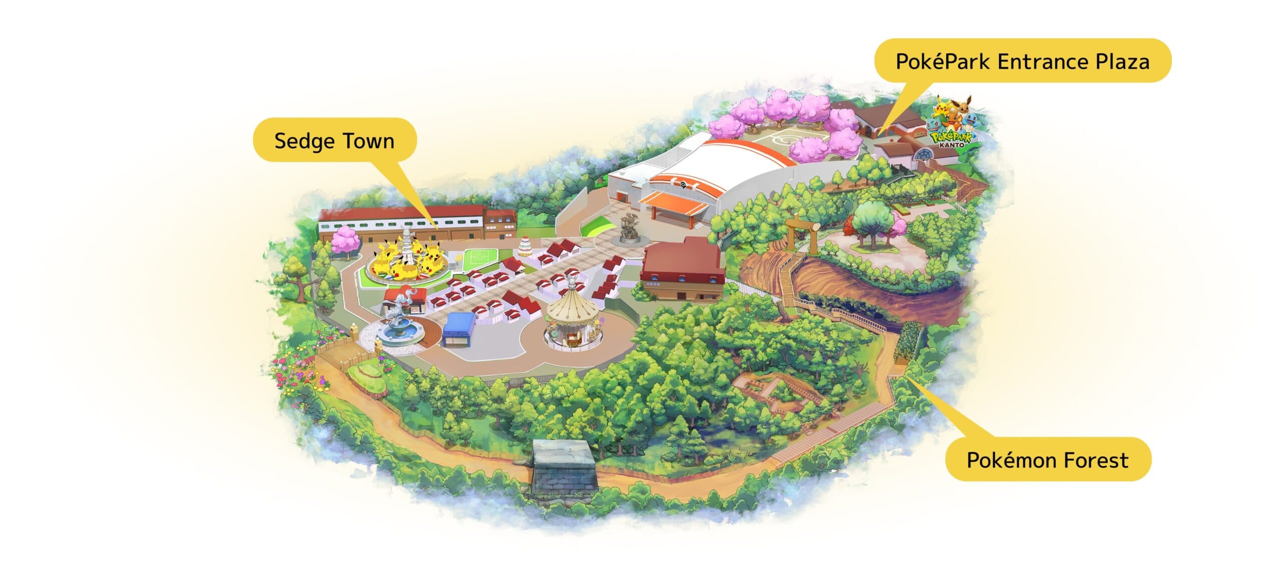 La zone est divisée en deux parties : Pokemon Forest, une balade à pied ponctuée de décors mettant en scène environ 600 Pokemon, et Sedge Town, une mini-ville avec un centre Pokémon, des attractions dont un carrousel, une offre de restauration et des boutiques.