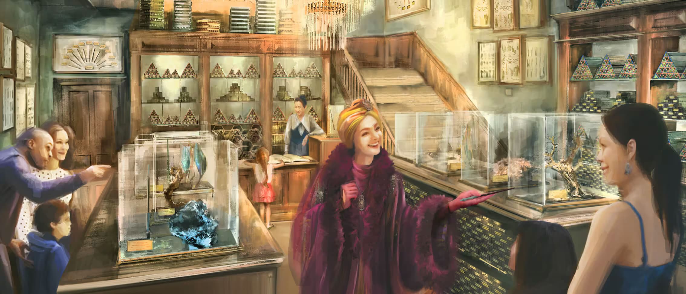 De nombreuses boutiques combleront les passionnés, avec l’équivalent français de Honeydukes pour les fans de confiseries : la boutique du renommé K. Rammelle. (Vous l’avez ?). Les aspirants sorciers pourront acheter leur baguette à Cosme Acajor Baguettes Magiques. Enfin, Les Galeries Mirifiques satisferont les visiteurs en quête d’un souvenir de leur périple britano-parisien .