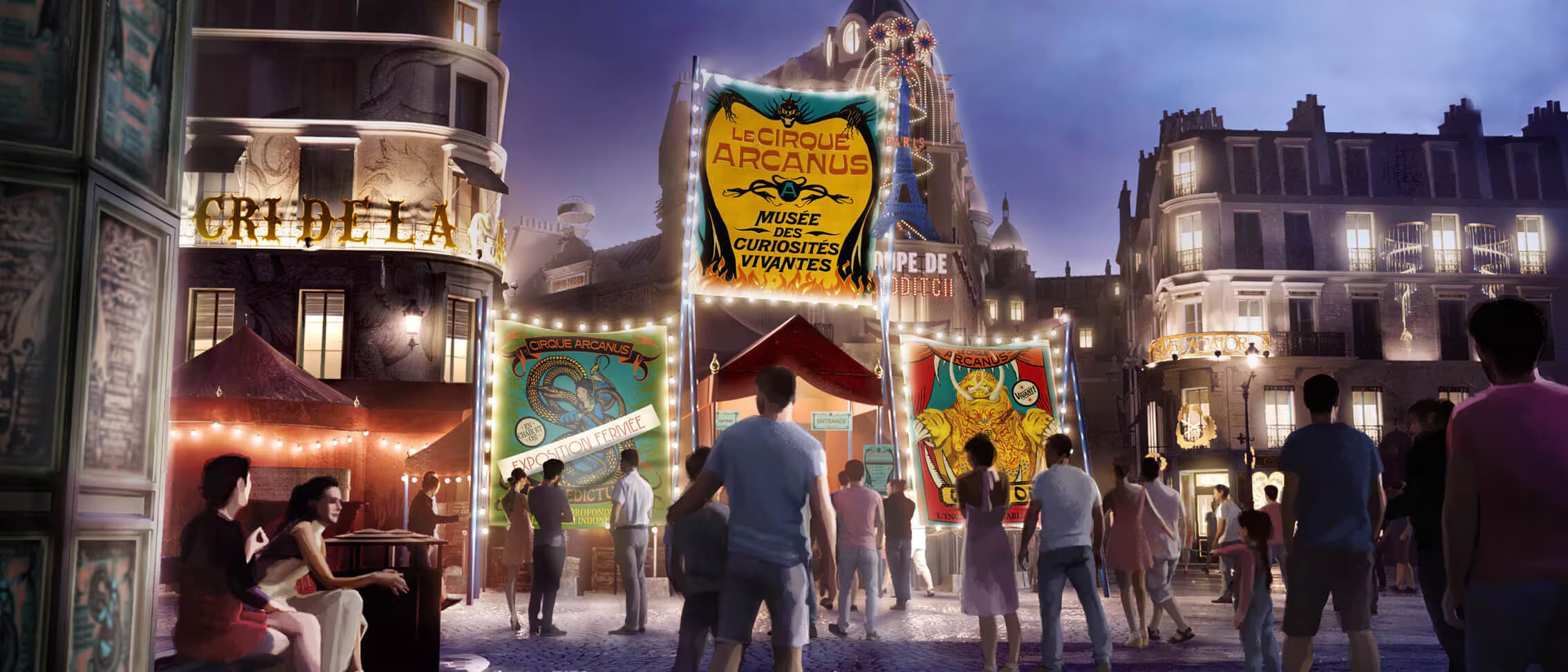En empruntant le portail surmonté d’une main dorée brandissant la baguette de sureau, nous entrons dans le Paris des années 20, représenté notamment dans la saga Les Animaux Fantastiques. En entrant d’abord dans un parc Moldu, les visiteurs pourront découvrir la Place Cachée bordée de magasins, de restaurants… et même d’un cirque ! Le niveau de détails semble avoir été poussé à son paroxysme, puisque l’on pourra même entendre des conversations en français entre sorciers et sorcières !