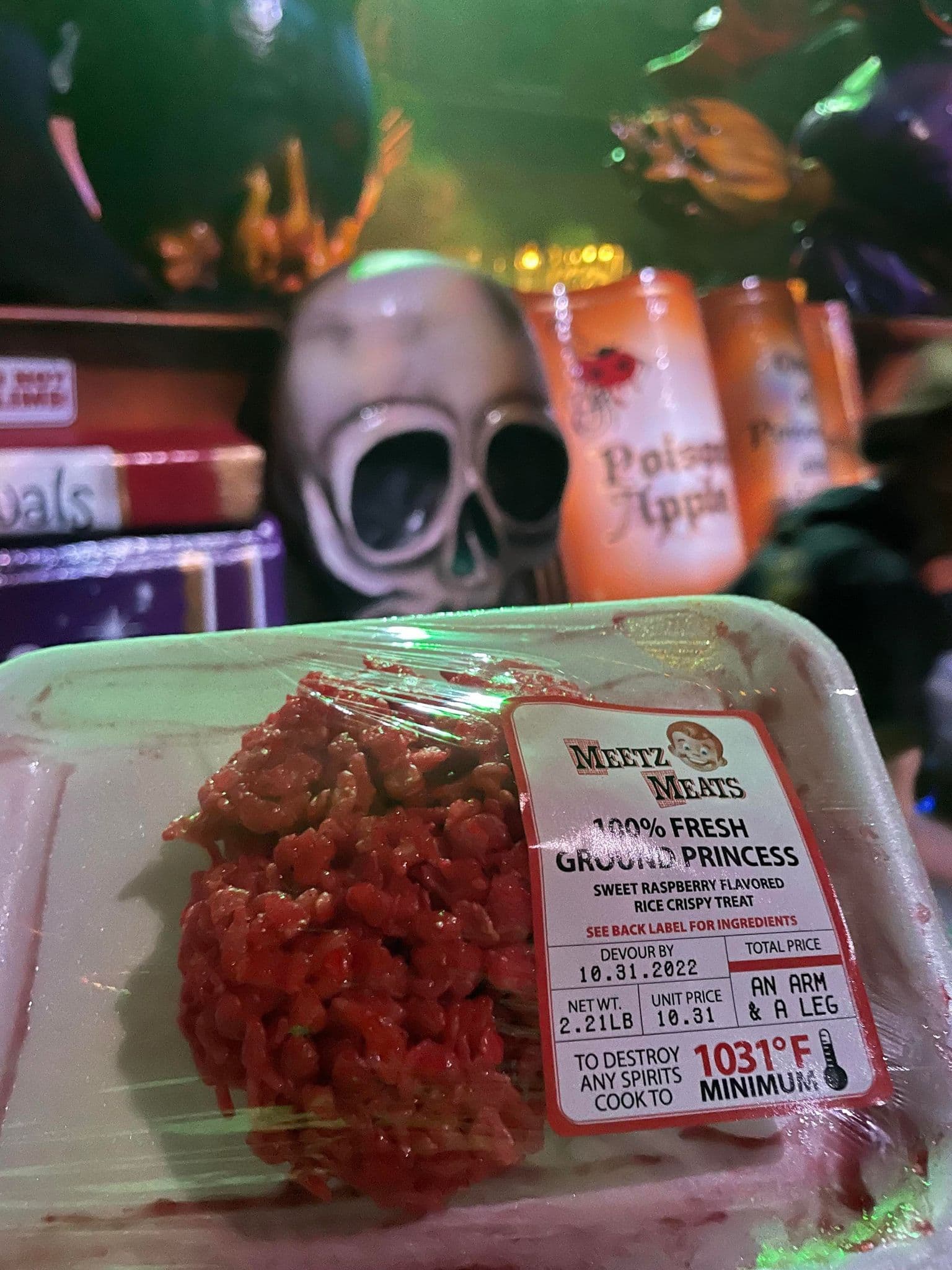 Pour reprendre des forces entre deux maisons hantées, les chefs d’Universal Orlando Resort ont concocté de nombreuses réjouissances inspirées de l’ambiance des soirées. Au menu des différents stands éphémères : des corn-dogs couverts de (faux) asticots, des feuilletés en forme de cercueil ou encore des sucreries ressemblant à s’y méprendre à de la viande en décomposition.