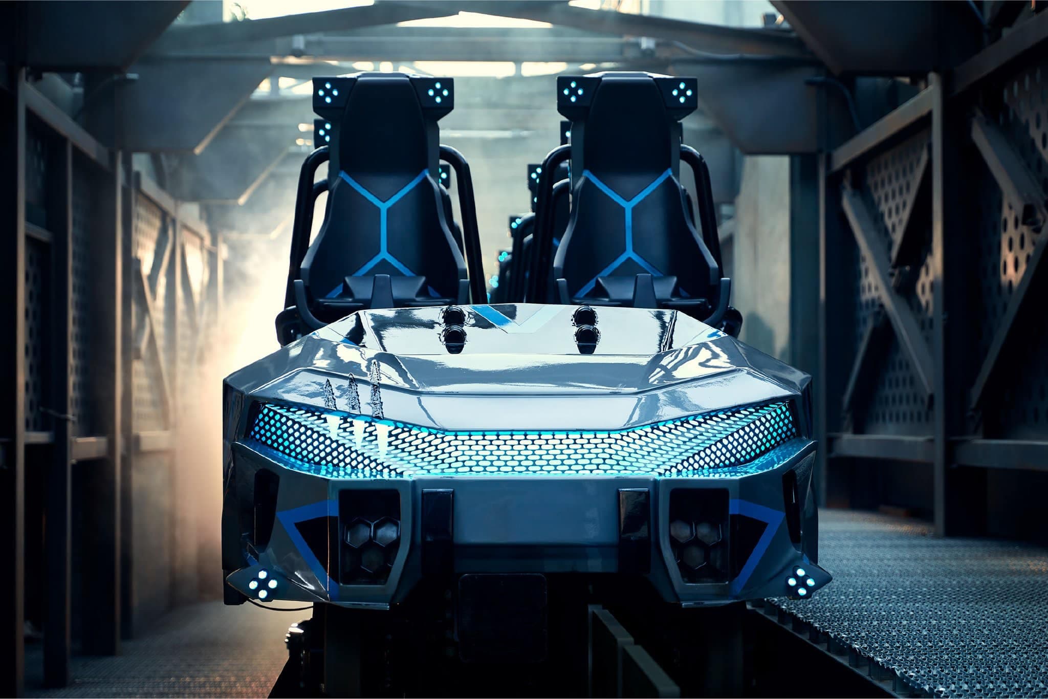 Les visiteurs embarqueront dans des véhicules au design très futuriste et étant équipés de nombreuses lumières bleues permettant un effet spectaculaire à la nuit tombée, lorsque les trains arpentent le parcours. Des traces de griffes de raptors viennent entacher la carrosserie et rappellent aux visiteurs le danger qui rôde.
