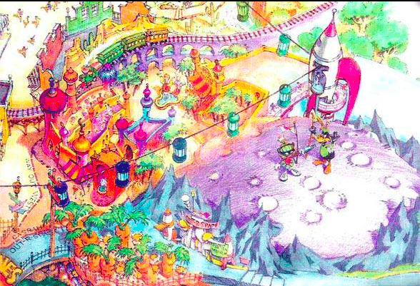Durant les deux années qui suivirent, de nombreuses pistes de concepts et de franchises furent explorées. Le premier choix se porta sur « Cartoon World », un parc à thèmes dédié aux univers cartoonesques de dessins-animés et de bandes-dessinées. Comme vous pouvez le remarquer sur le concept ci-dessous, la structure du parc n’était pas pensée autour d’un lagon central, comme nous la connaissons actuellement.