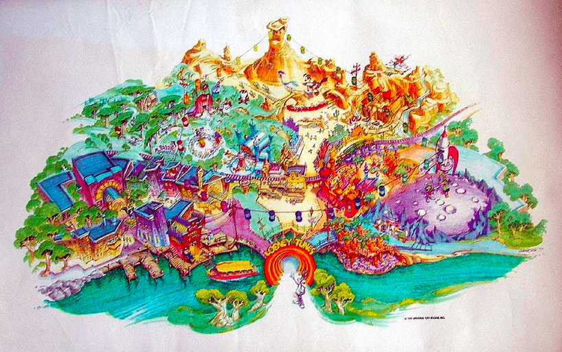 Une immense zone dédiée à Bugs Bunny et ses amis fut à l’étude, comme l’illustre ce concept d’intention créative. On y remarque des parties aux thématiques variées : de l’usine ACME à la planète de Marvin le Martien en passant par une zone plus rurale.