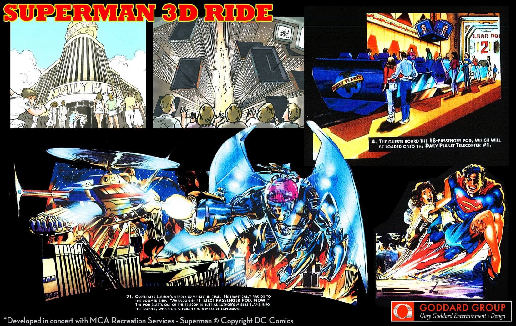 Superman n’était pas en reste avec un concept de « 3D Ride » dont le bâtiment d’entrée n’était autre que celui du Daily Planet (le journal où travaille Clark Kent). Les visiteurs auraient alors embarqué pour une virée nocturne dans les rues de Métropolis. Mais tout ne se serait pas déroulé comme prévu et Lex Luthor aurait tenu à y mettre son grain de sel… un synopsis qui n’est pas sans rappeler celui de l’attraction « The Amazing Adventures of Spider-Man ».