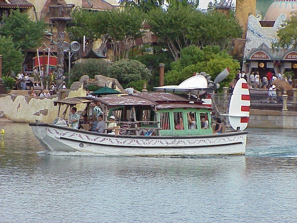 A l’extrémité de l’île, où les visiteurs peuvent choisir leur prochaine destination, l’attraction Skipper Island Tours permettait d’embarquer pour une croisière sur le lagon en direction de l’île Jurassic Park. 3 bateaux aux looks divers et variés accueillaient alors les visiteurs : The Boatney, The Tropic Trader et The Sam Plane.