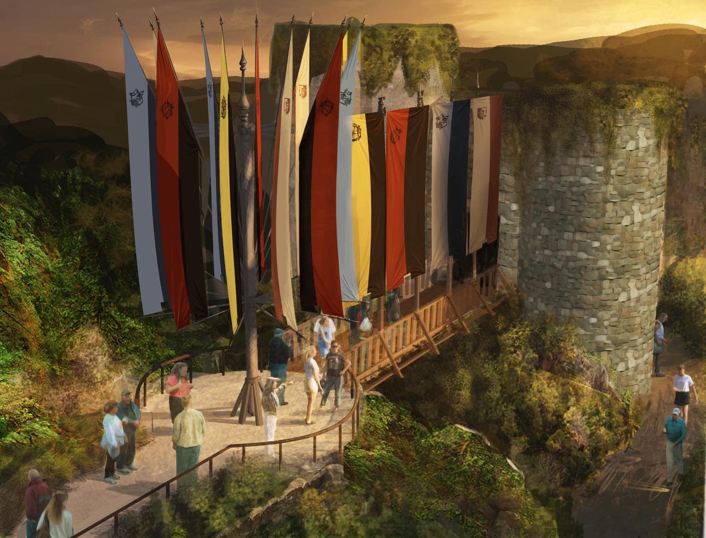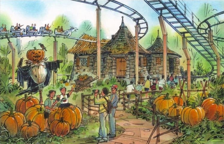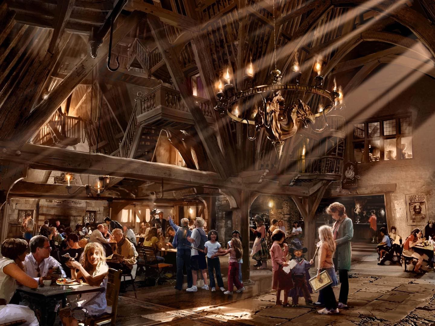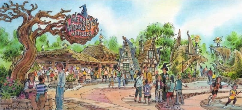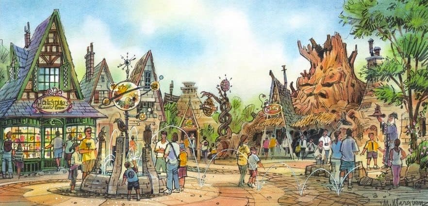 Dans les premiers concept-arts, les principaux bâtiments et icônes apparaissent comme conservés et adaptés : ainsi, on aperçoit l’Enchanted Oak Tavern et les statues de Dragons.